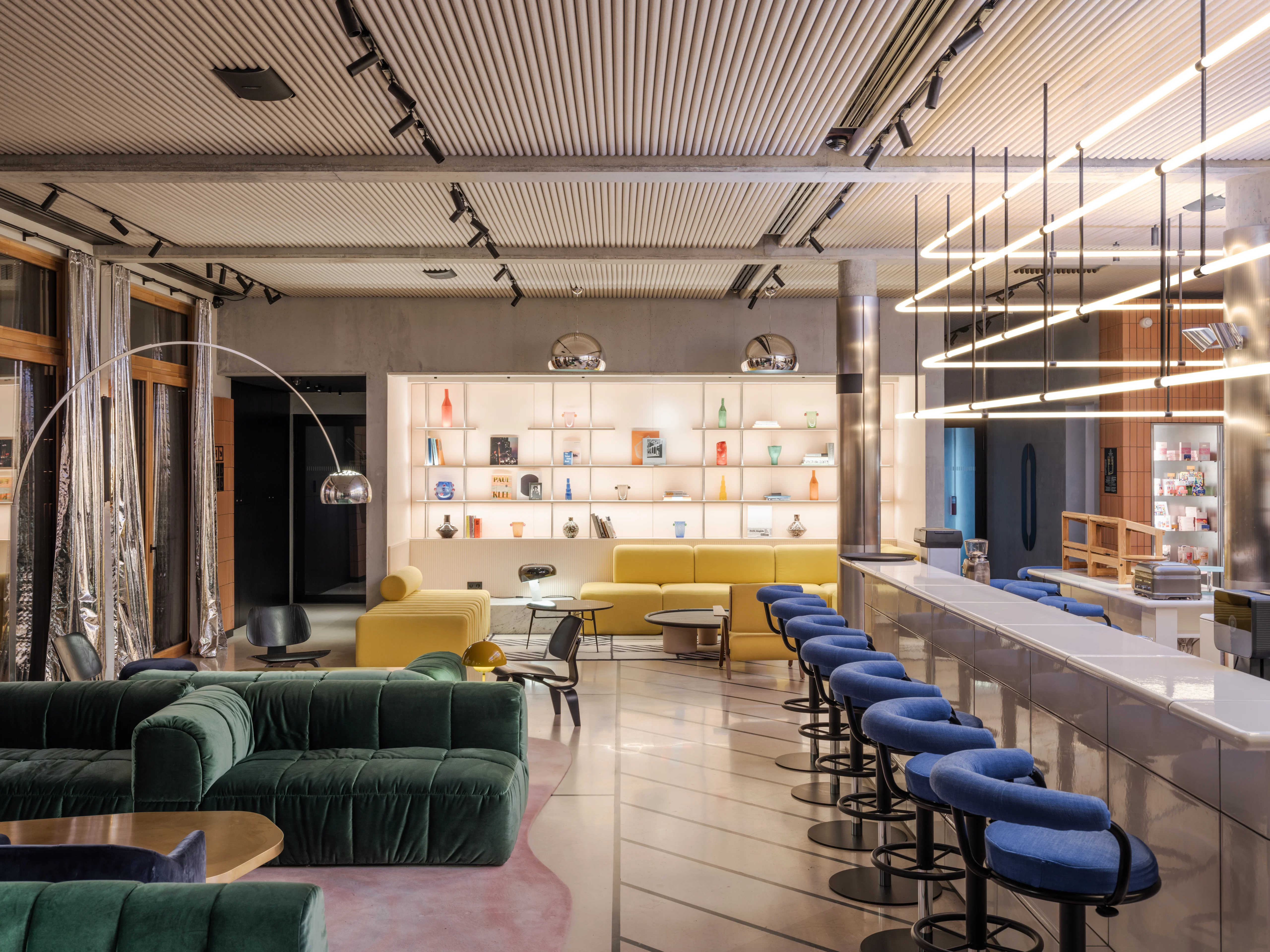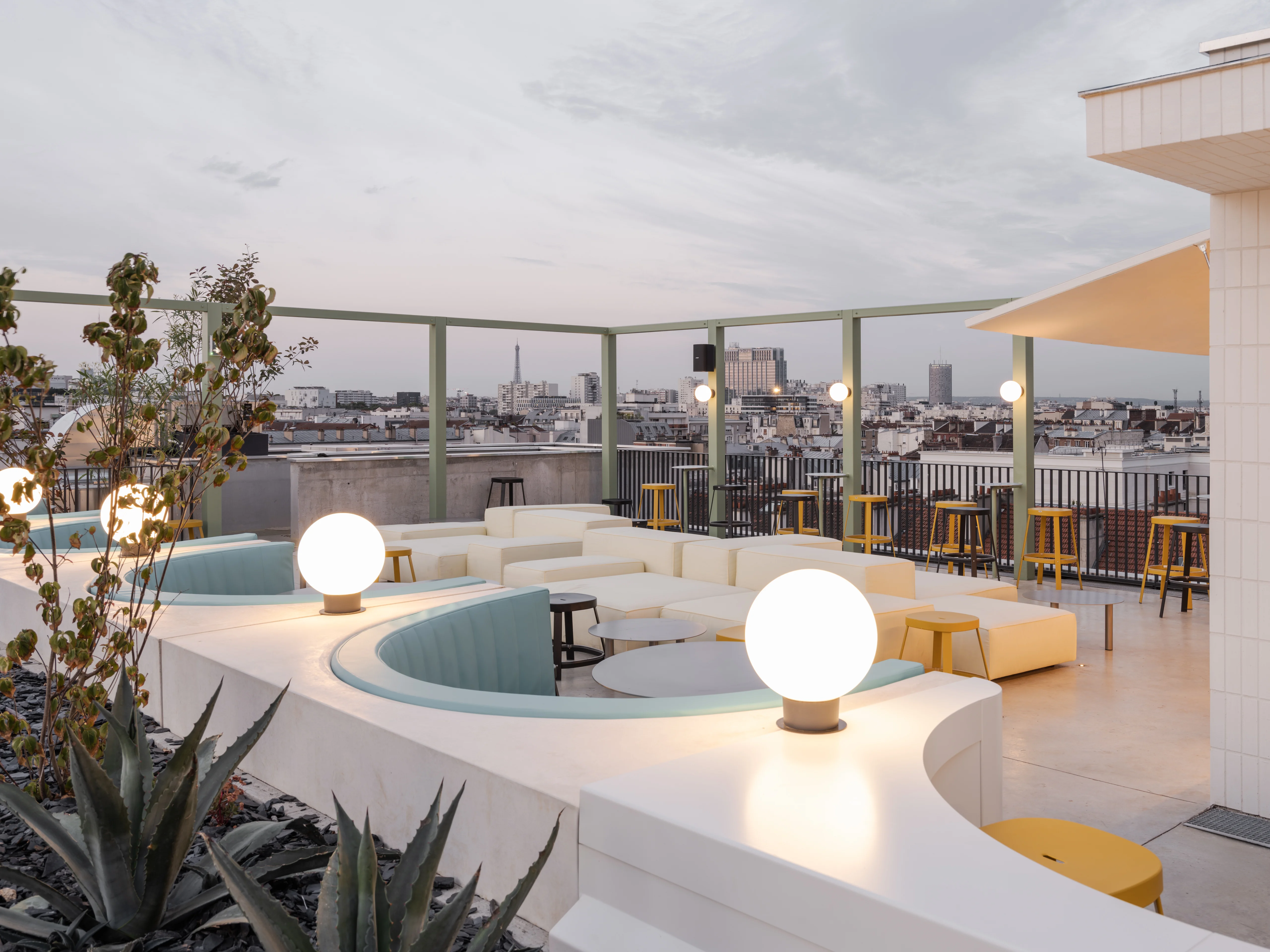 À l’intérieur et sur le rooftop, l’agence Ciguë propose un univers coloré aux accents Art déco qui se mêlent à la brutalité du béton, un contraste subtil avec l’enveloppe extérieure. Pensé comme un lieu de vie, il accueille voyageurs d’affaires et visiteurs en quête de détente autour d’un restaurant et d’un social hub propices au travail, aux échanges et aux moments de pause.